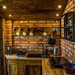 Här finns mathörna med köksutrustning, såsom kylskåp, köksredskap och glas.